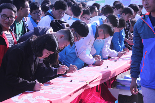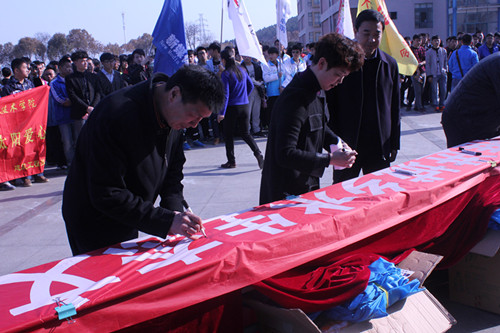 启动仪式结束后,铜山区委副书记杨勇一行随同我校领导及各职能部门负责人在印有“加强水资源保护与修复,推进城乡水生态文明建设”的条幅上签字。与此同时,有奖知识问答、节水漫画征文展示、节水倡议书发放等宣传活动有序进行。