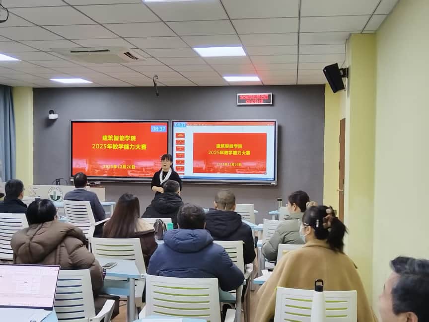 大赛自2025年9月初开始筹备,学院班子认真组织、精心谋划,10月下发了《关于开展开展建筑智能学院2025~2026学年第一学期教师教学能力大赛的通知》(建智学院院发〔2025〕26号)。各教研室按专业组建了3支专业教学团队。比赛过程中,教师准备充分、意气风发、精神抖擞,提纲挈领地阐述了教学内容,教学设计详实具体,特色与创新点突出,智慧AI手段运用纯熟,通过精彩的教学设计和生动有趣的讲解,体现了教学团队对于课堂教学的理性思考和改革创新,展现了建筑智能学院教师昂扬向上、锐意进取的精神风貌。主持人随机抽取教师现场做精彩点评,全院老师从团队成员配合、教学内容与资料准备、信息化手段、教师教学素养等方面进行了现场打分。赛后学院院长陈益武做了总结发言,勉励大家守正创新,功利学子,点滴做好教学本质工作。